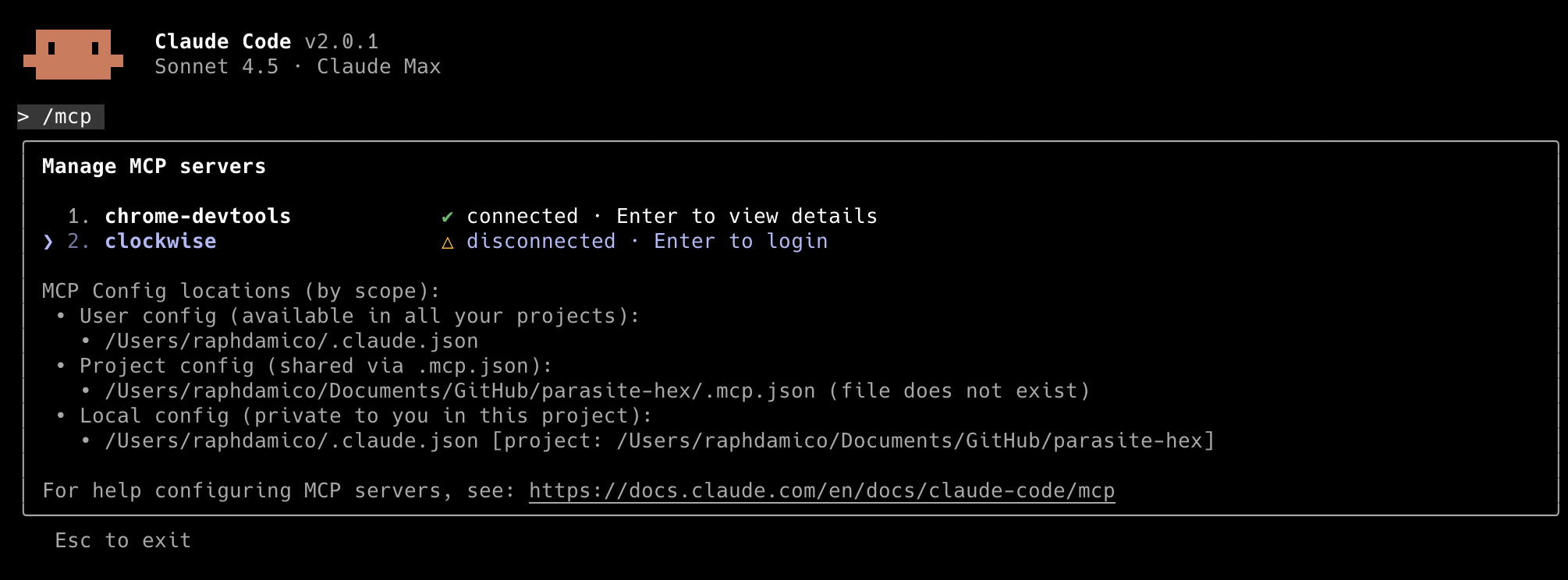 clockwiseshould be in the list. If it's listed asdisconnectedfollow the instructions to login using your browser - More details in Claude's documentation at https://code.claude.com/docs/en/mcp