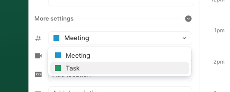 - Tasks: Tasks help you find the perfect time slots for your to-dos, automatically. Click your desired time in the calendar, name the task (e.g., “Book offsite travel”), then open “More settings” to categorize it as a task.